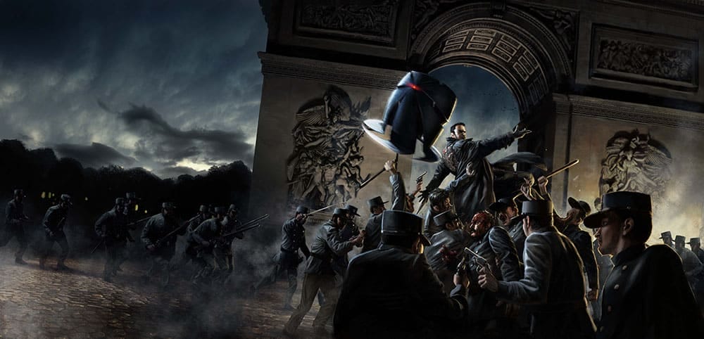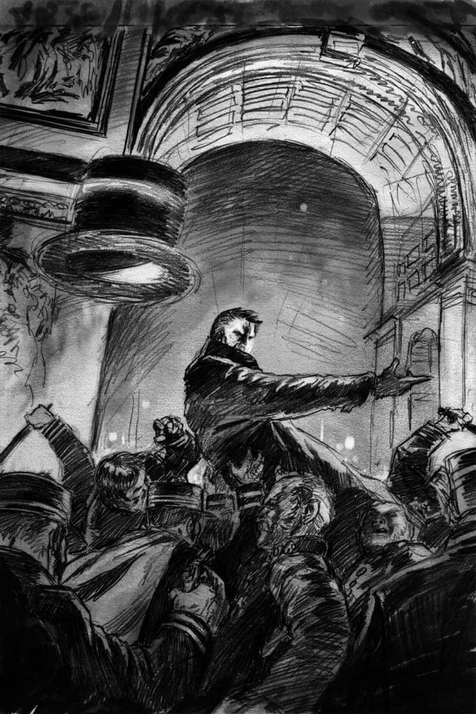 It was interesting because Stephan was remarkable to work with, and I was really trying to expand my relationship with him but he's so busy. So, he recommended you. And you did these super cool [Card Soldier] concepts that got me excited about working with you on the re-release cover of Hatter M. Far from Wonder. What I love about that story is what you told me on the phone previous to this interview. It was a cover of Hatter Madigan finding himself in Paris lost and separated from Alyss and he gets surrounded by a lot of police. One of the things I really wanted from you was a dynamic pose of Hatter throwing his hat which is very difficult to do. I had asked a couple of other concept artists to do it before you not for the cover but just so I could see the motion. You sent me two pencil sketches. One where he was standing upright, the police were below him and he was throwing the hat. Another one where they had engulfed him and he was throwing it up in the air. The second one was the most visceral, but I chose the pose where you really saw his body. It was like an athlete throwing the hat. I loved it. But, what was really funny to me was I said to you “you did such a great job with the police” and “they came to life”. You told me that it was you. Your image was the same face for all those policemen.