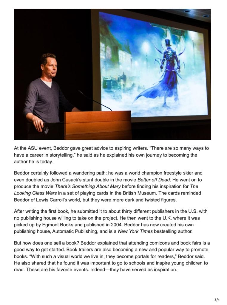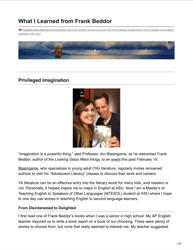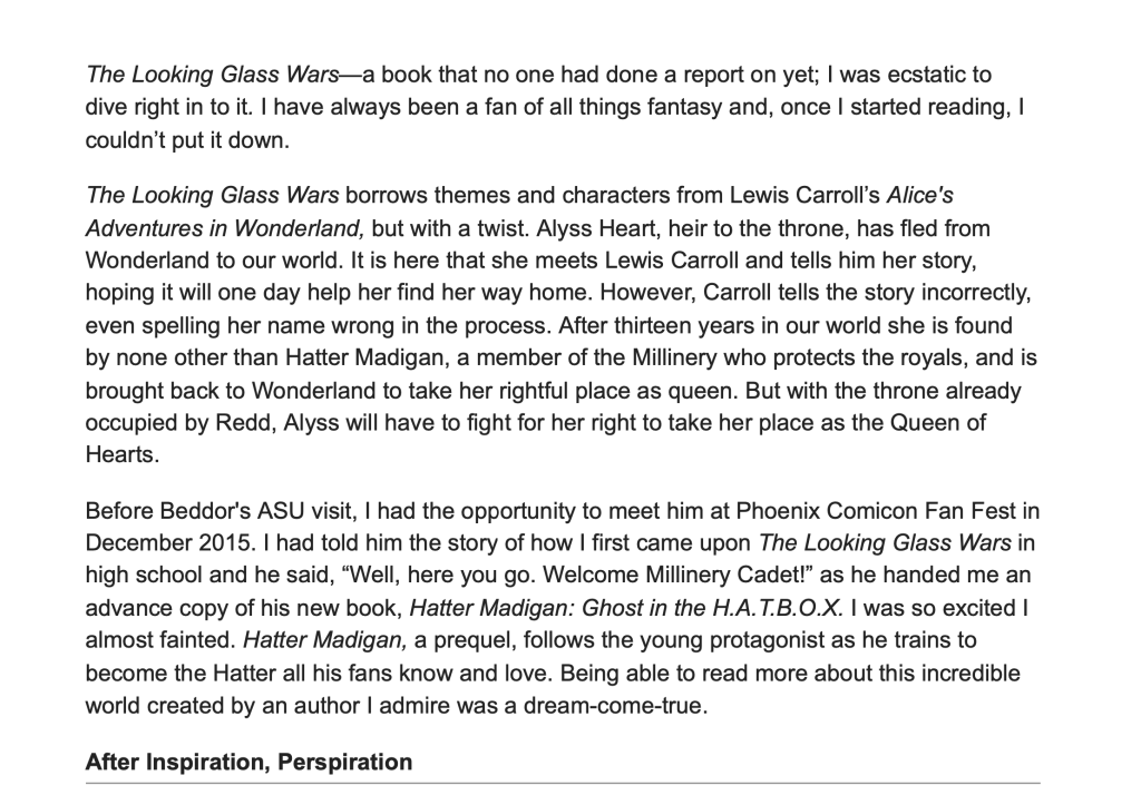 I met Kira Assad (the writer of the article below) when I spoke at an event hosted by Professor James Blasingame at Arizona State University during the promotional tour for Hatter Madigan: Ghost in the H.A.T.B.O.X. Kira told me an amazing story about how The Looking Glass Wars inspired her to study English in college and to write fiction herself. It’s so gratifying and humbling to know that my work has been a looking-glass through which young people fall in love with reading and storytelling. As evidenced by the stern English lad who inspired six graphic novels, sometimes your readers can provide the biggest sparks of imagination.