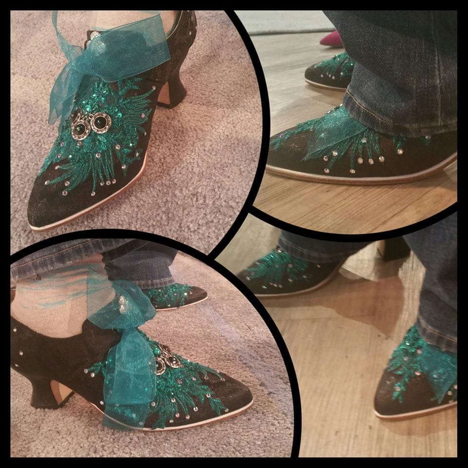 I worked with American Duchess in Nevada to create them, they are French court shoes made in black brocade, and they were made specifically For Whoopi. Once I had them I did the handwork and glammed them up, and fitted them with Club shaped Cabochons and crystal work to create something sparkly and immaculate. The soles of the shoes are also stamped with the Looking Glass Wars Logo.