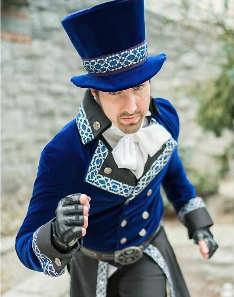 As for the shirt, any dark shirt will work here, if you want to, a double vested vest will add more texture and details. Don’t be afraid to get fancy with it – while Hatter Madigan is a fighting machine, he is also a ROYAL bodyguard. Add some swank to you Hatter look like this guy who dressed to impress in Heart Palace: