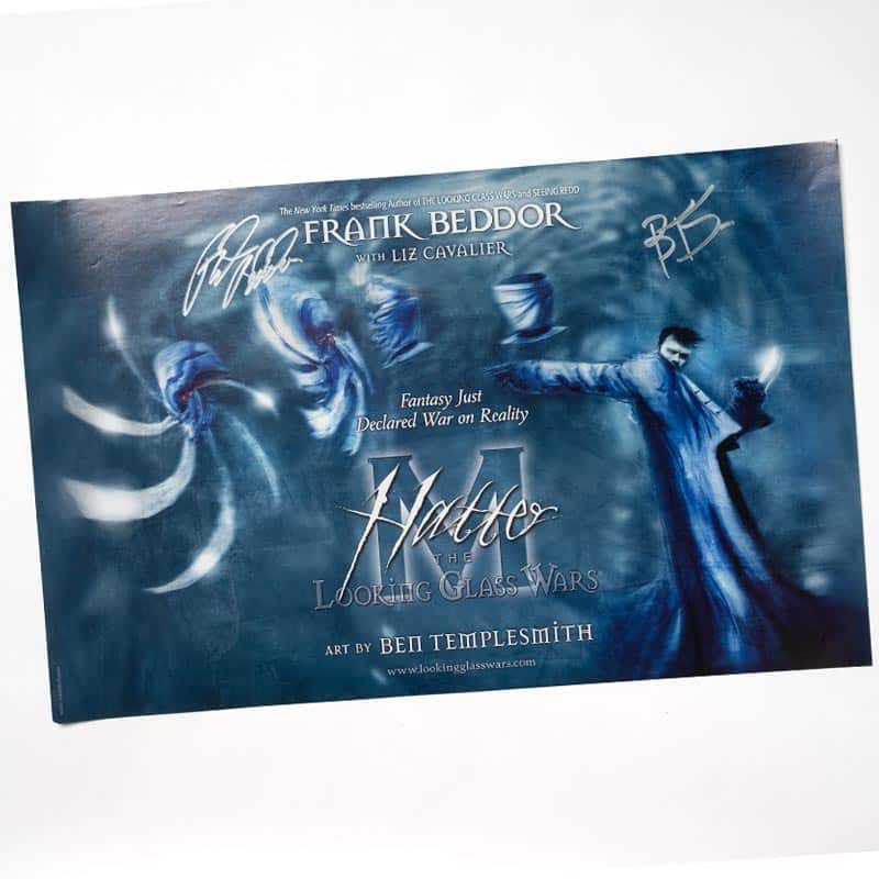A Limited Run Collector’s Item featuring the Hatter M. Volume 1 cover art signed by author Frank Beddor and Illustrator Ben Templesmith.