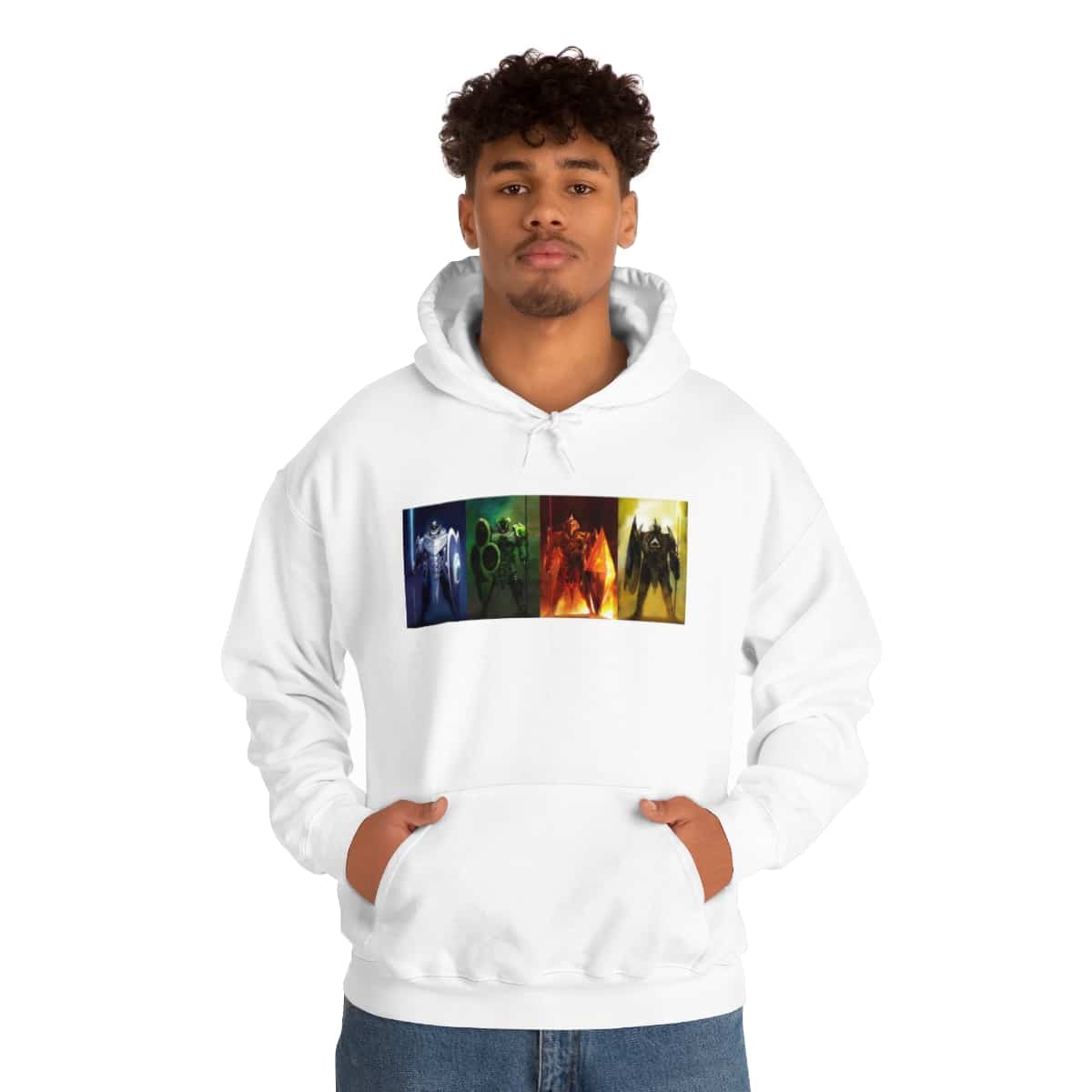 Pick a side and deal them out! This unisex heavy blend hooded sweatshirt shows off your love of Wonderland with a powerful display of Card Soldier Sheildbearers from the Suits of Hearts, Diamonds, Clubs, and Spades. Made with a thick blend of cotton and polyester, it feels plush, soft and warm, a perfect choice for any cold day. In the front, the spacious kangaroo pocket adds daily practicality while the hood's drawstring is the same color as the base sweater for extra style points.