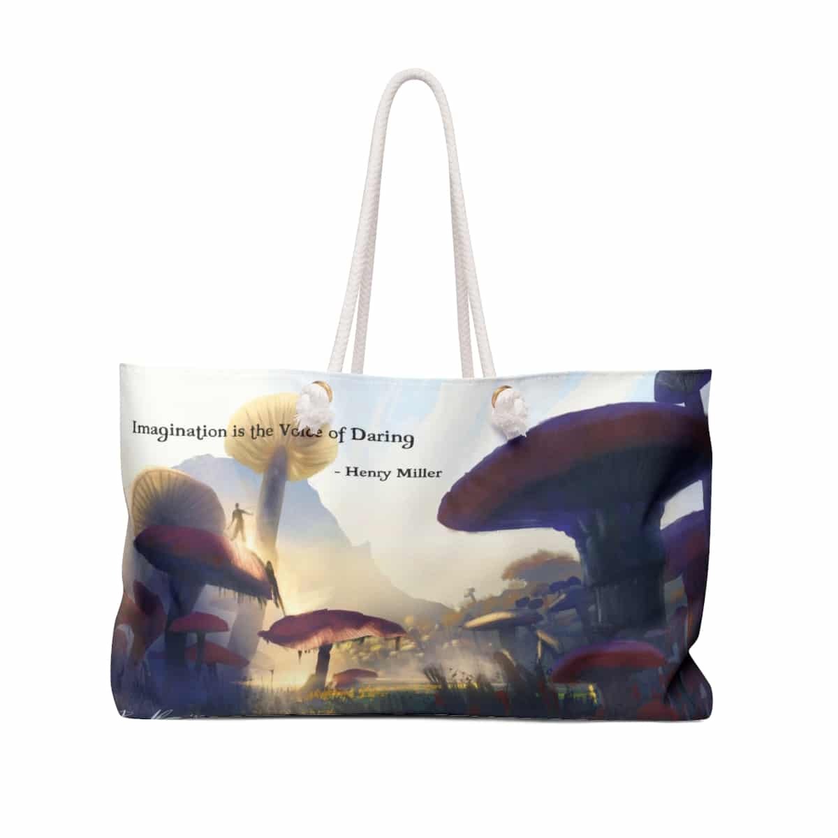 This oversized Wonderland Weekender Tote is perfect for your weekend at the Pool of Tears, or the River Thames. The wide-mouthed, durable bag holds a generous amount of personal items and is easily held by its thick rope handles. The stunning Valley of Mushroom art is by Brian Flora, and to top it all off you can take inspiration with you on the go with a quote by Henry Miller.