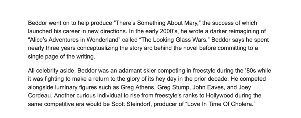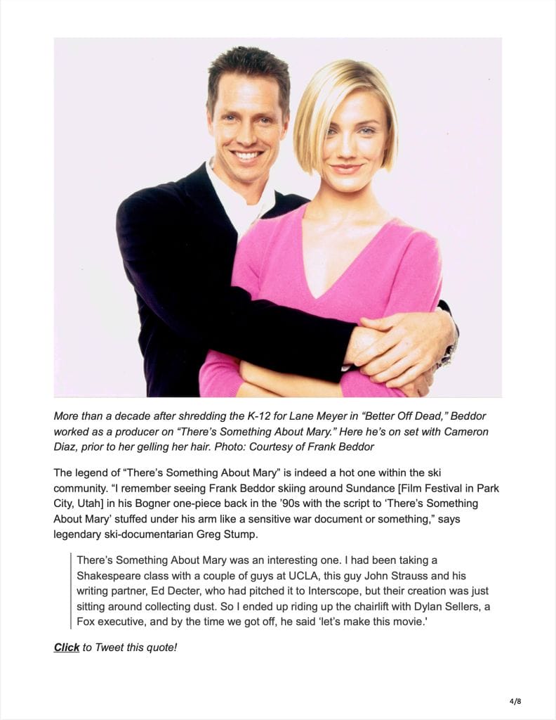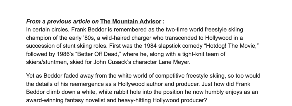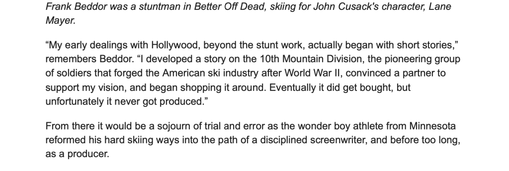Rereading Christine Dietzel’s piece in Teton Gravity brought back all those wonderful memories of how my skiing career opened a door to the entertainment industry. My success in the skiing world led to work as a stunt skier in films such as “Hotdog! The Movie” and the black comedy “Better Off Dead” starring John Cusack. This led to acting roles and forming relationships with a variety of talented filmmakers. The origins of There’s Something About Mary took place on the slopes (and chairlifts) of Sundance. The thriller I produced, Wicked, garnered rave reviews after its Sundance screening and helped launch the career of our star Julia Stiles.